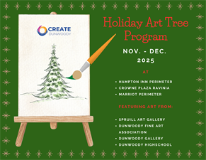 Proceeds support both the artists and Create Dunwoody’s mission to provide arts and culture for economic development. This program will run from mid-November through December.